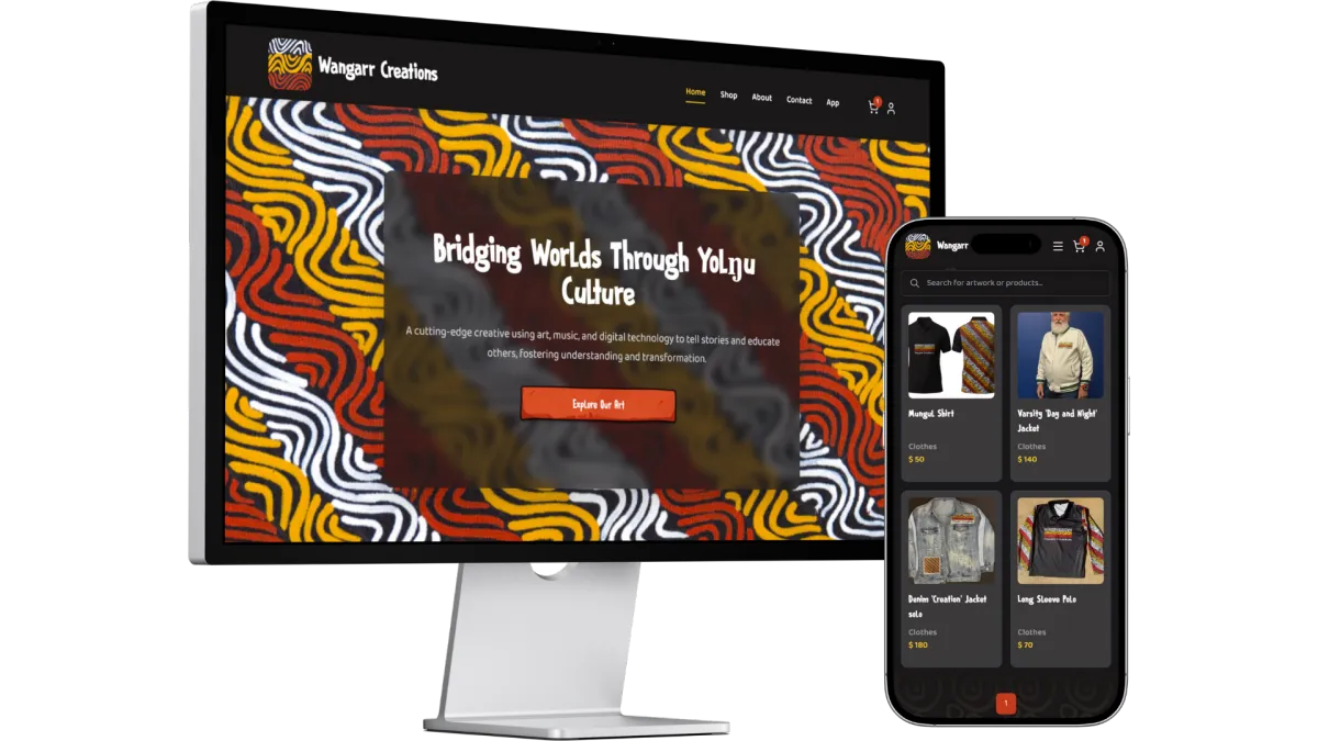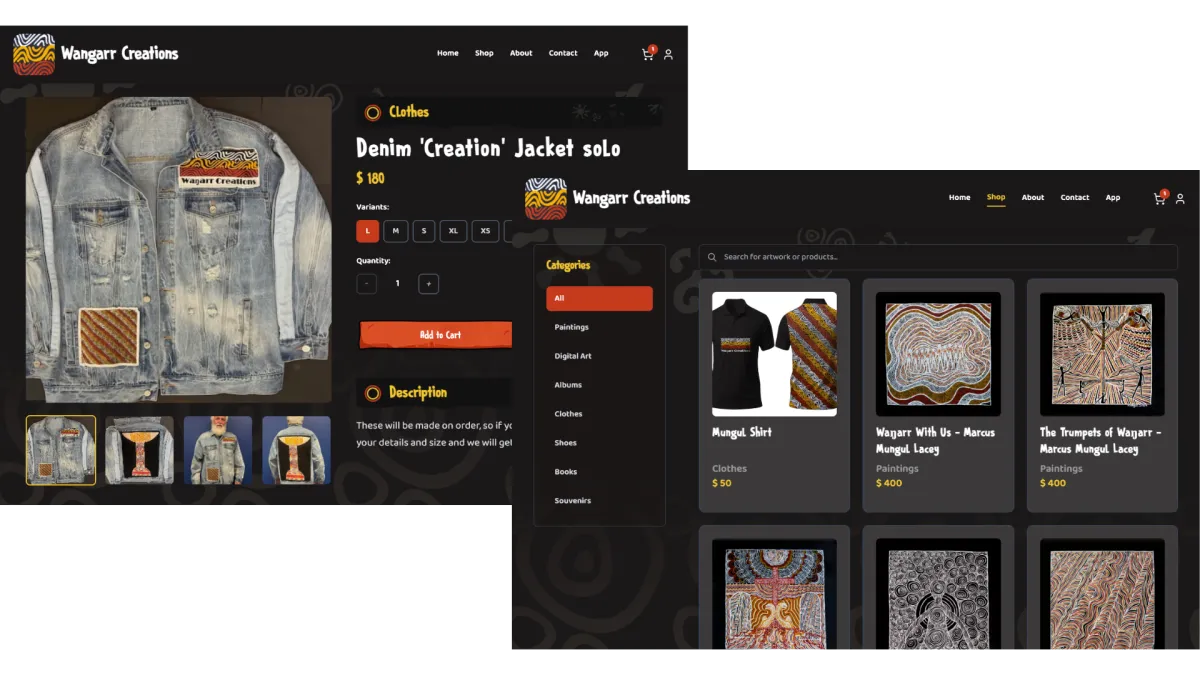 Wangarr Creations is a culturally rich web application developed to celebrate and promote Aboriginal heritage. The website provides a multifaceted experience, offering users access to authentic artworks, and a curated online store for products, including clothes, paintings, and handcrafted souvenirs..